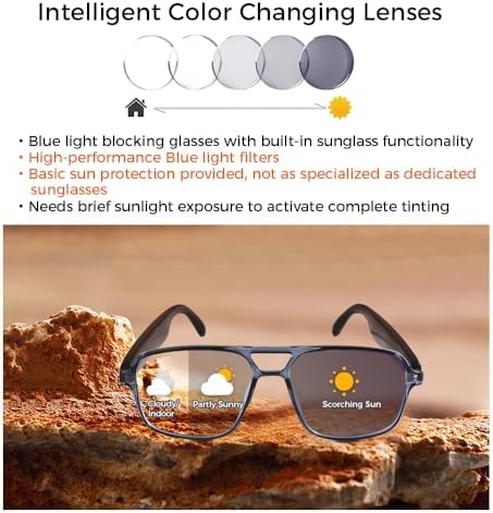 Smart Glasses Bluetooth Audio Glasses Sunglasses Blue Light Glasses for Men Women, Dual Mic & Speakers, UV Protection, Color-Changing, Music/Calling/Voice Assistant/Remote Photography